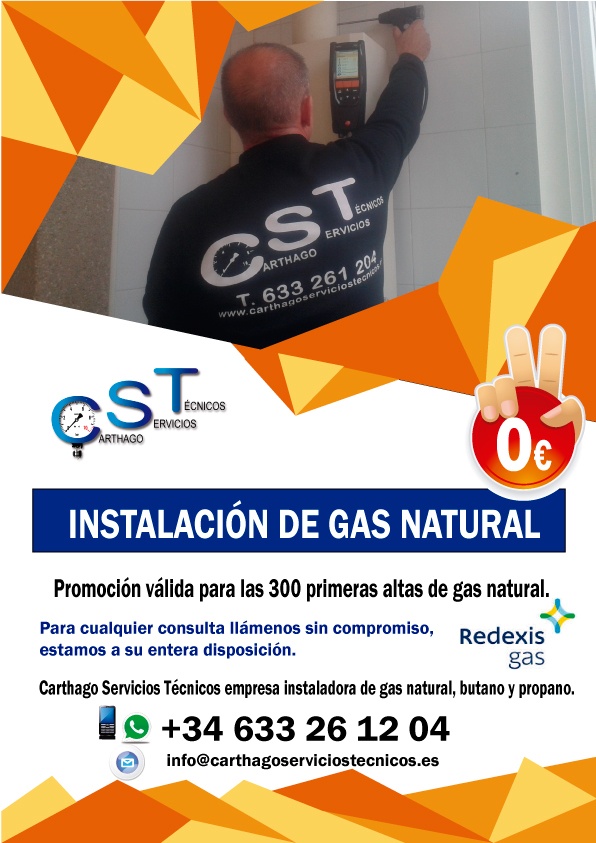 Carthago Servicios Técnicos es empresa instaladora y mantenedora de Instalaciones de Butano, Propano y Gas Natural, pudiendo emitir el Certificado oficial de Inspección Periódica Obligatoria cada 5 años y colaboramos con las empresas Redexis gas y Repsol para gestionar y proporcionar el alta de las instalaciones, así como resolver las incidencias detectadas por sus inspectores. Carthago Servicios Técnicos también es empresa instaladora y mantenedora de equipos a presión (compresores y depósitos, instalaciones de aire comprimido y cámaras hiperbáricas). Además realizamos la instalaciones de todo tipo de aparatos de gas (calentadores, cocinas, hornos, etc), termos eléctricos y equipos de ósmosis.